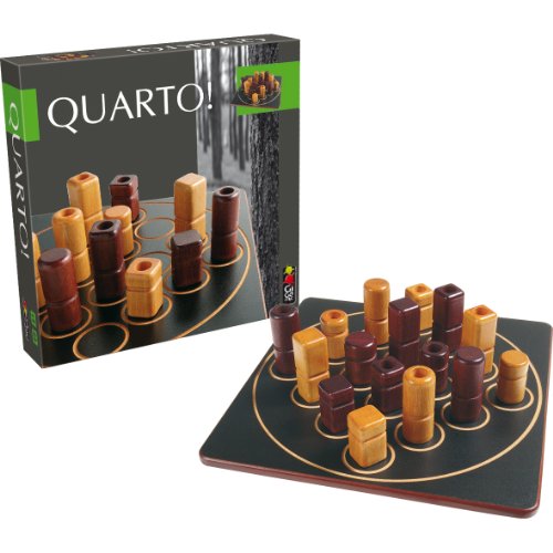 Each of the 16 pieces has 4 different attributes. The aim is to line up 4 pieces that share the same attribute (round or square; light or dark; tall or short; solid or hollow). The problem is you can't choose which piece you're going to play - your opponent chooses for you. Contents: one board, 16 wooden pieces. For 2 players ages 6 and up.You will not be disappointed with